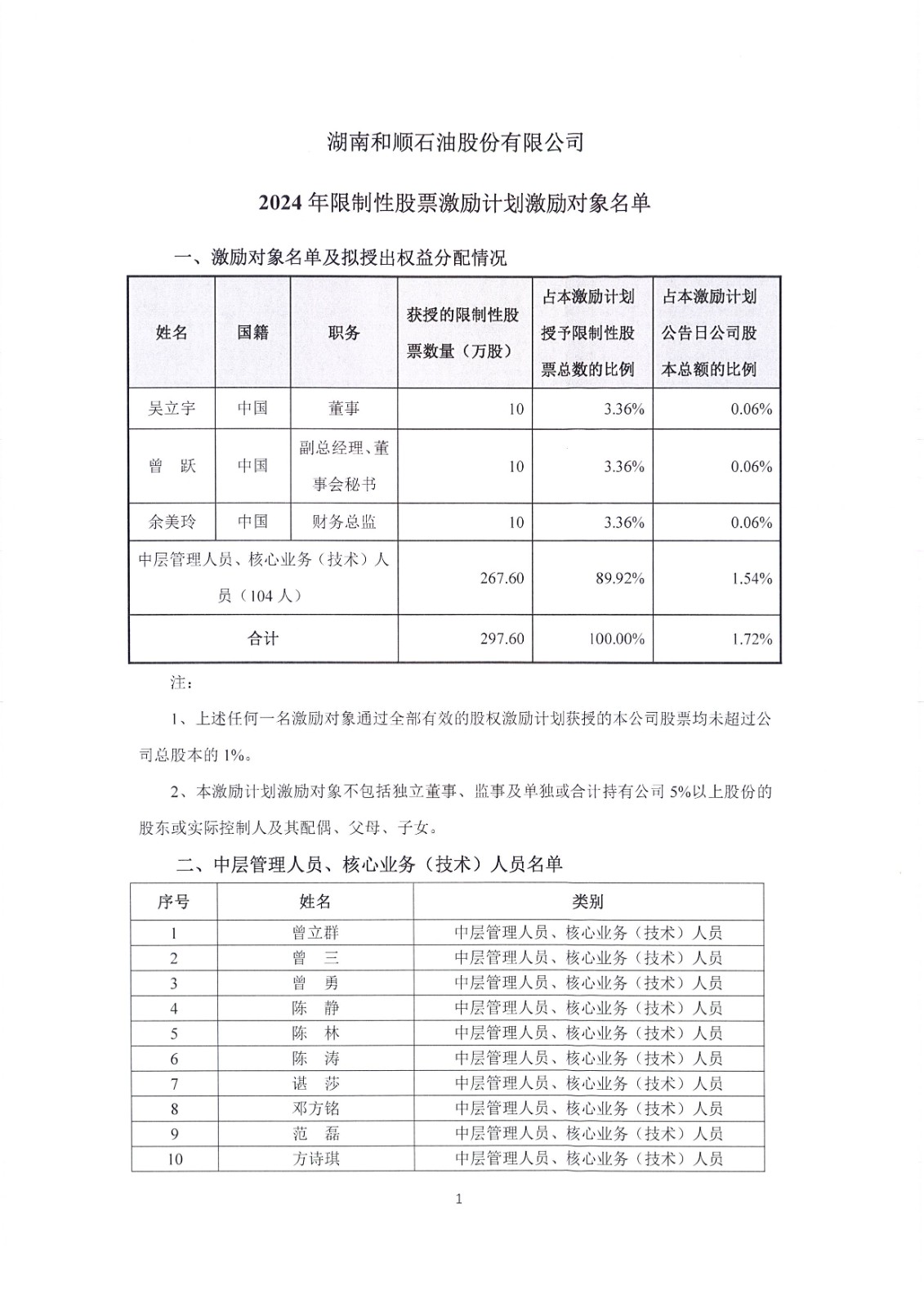 湖南和順石油股份有限公司(以下簡稱“公司”)于2024年4月25日召開第三屆董事會第九次會議和第三屆監(jiān)事會第八次會議,審議并通過《關于公司<2024年限制性股票激勵計劃(草案)>及摘要的議案》等相關議案。根據(jù)中國證券監(jiān)督管理委員會《上市公司股權(quán)激勵管理辦法》的有關規(guī)定,公司對2024年限制性股票激勵計劃激勵對象的姓名和職務進行如下公示,公示期為2024年4月30日至2024年5月9日,共10天。在公示期間,對公示對象有異議的,可經(jīng)書面郵件形式向公司監(jiān)事會反映,接收郵箱為:pengmujun@hnhsjt.com。