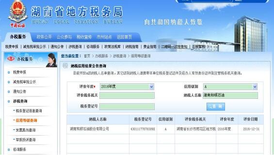 為推進(jìn)社會(huì)誠(chéng)信體系建設(shè),湖南省國(guó)稅局、地稅局按照國(guó)家稅務(wù)總局《納稅信用管理辦法(試行)》(總局公告2014第40號(hào)),開(kāi)展了2016年度納稅信用聯(lián)合評(píng)價(jià)工作,我司再次獲得納稅信用“金字代言——A級(jí)納稅人”的稱號(hào),我司已連續(xù)三年獲此榮譽(yù),展現(xiàn)了誠(chéng)信納稅的良好企業(yè)形象。