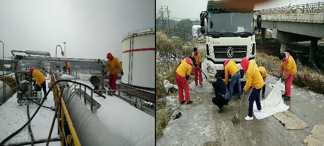 寒風(fēng)中,油庫一線員工為維護正常卸、發(fā)油而冒雪工作,檢查設(shè)施設(shè)備狀態(tài);物流車隊司機們風(fēng)雪無阻,排除困難,按時按點將油品安全送達客戶、送到各站點;各個加油站基層員工通力合作,掃除油站積雪,保障油站進出通道順暢通行和行車安全;總部行政、物業(yè)人員也及時給辦公樓前坪進行掃雪、除冰,為行政辦公工作保駕護航。